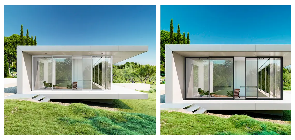 Con perfiles discretos que prácticamente desaparecen del campo visual, permite amplias superficies acristaladas, integrando el interior y el exterior con total naturalidad.